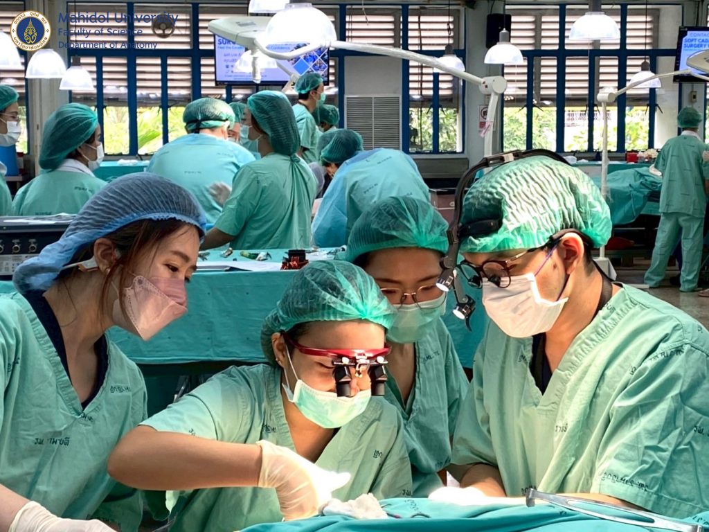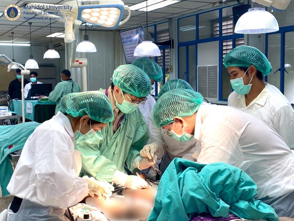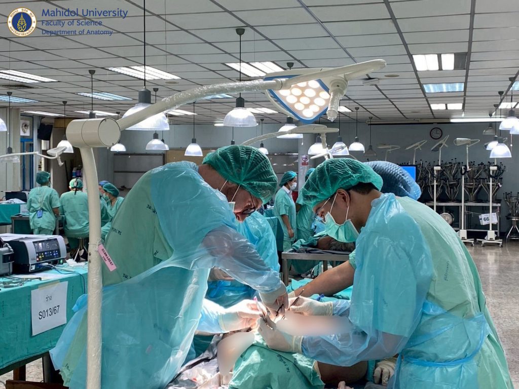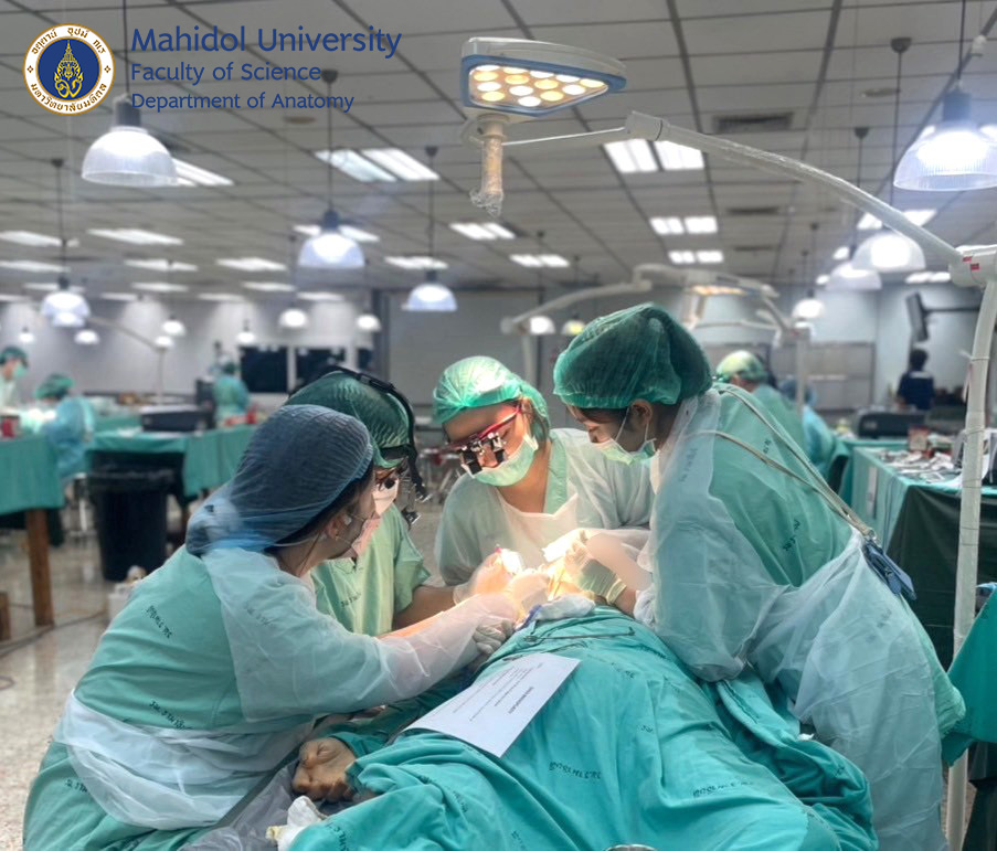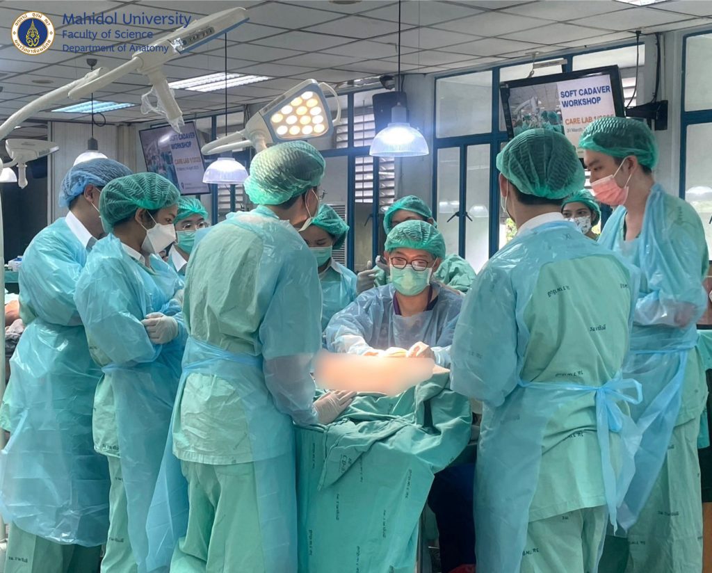 เมื่อวันที่ 31 มีนาคม และ วันที่ 1-4 เมษายน 2568 ผู้ช่วยศาสตราจารย์ นายแพทย์ ชินวุฒิ สุริยนเปล่งแสง และทีมเจ้าหน้าที่ของภาควิชากายวิภาคศาสตร์ คณะวิทยาศาสตร์ มหาวิทยาลัยมหิดล ได้ร่วมจัดการอบรมเชิงปฏิบัติการกับภาควิชาศัลยศาสตร์ คณะแพทยศาสตร์โรงพยาบาลรามาธิบดี มหาวิทยาลัยมหิดล ให้กับศัลยแพทย์สาขาต่างๆ อาทิ ศัลยศาสตร์ทั่วไป ศัลยศาสตร์ตกแต่ง ประสาทศัลยศาสตร์ ศัลยศาสตร์เต้านม ศัลยศาสตร์ทรวงอก ศัลยศาสตร์ระบบปัสสาวะ ศัลยศาสตร์ตับ ตับอ่อน ทางเดินน้ำดี ฯลฯ แพทย์ประจำบ้านต่อยอด แพทย์ประจำบ้านและนักศึกษาแพทย์ได้ฝึกหัตถการผ่าตัดในร่างอาจารย์ใหญ่แบบนุ่มเสมือนจริง (soft cadaver) เพื่อเพิ่มความชำนาญในการผ่าตัดรักษาคนไข้มากยิ่งขึ้น ณ ห้องปฏิบัติการ มหกายวิภาคศาสตร์ AN1-301
