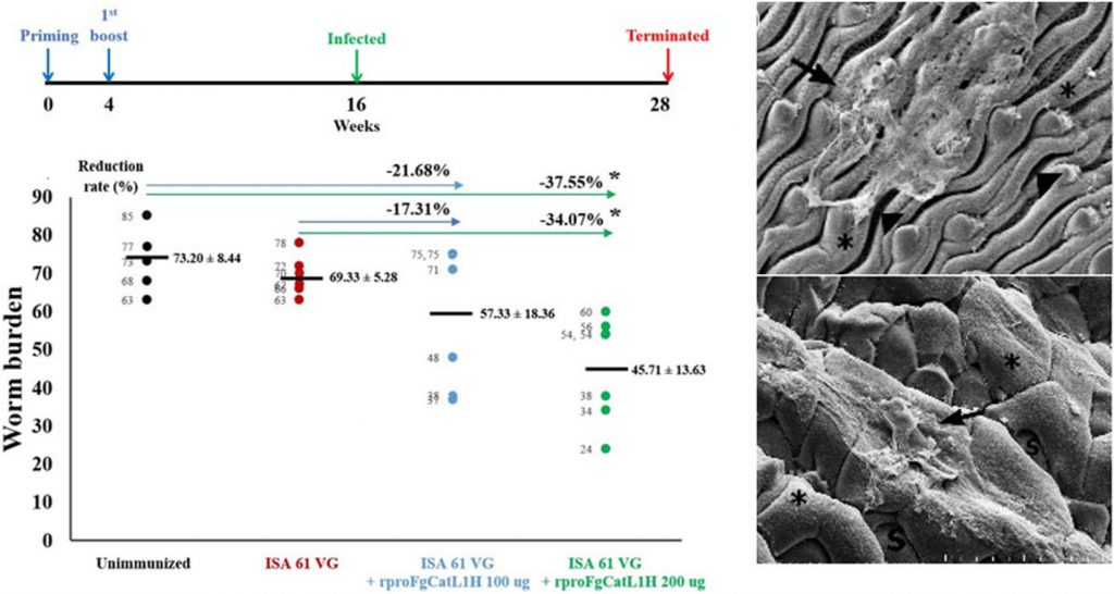 โปรตีนรีคอมบิแนนท์ rproFgCatL1H สามารถลดการติดเชื้อพยาธิใบไม้ตับในแพะได้ คิดเป็นร้อยละ 34-37 และทำให้ผิวพยาธิเกิดความเสียหายอย่างชัดเจนเมื่อตรวจสอบภายใต้กล้องจุลทรรศน์อิเล็กตรอน แม้ความสัมพันธ์กับระดับแอนติบอดียังไม่เด่นชัด ผลการศึกษานี้ชี้ให้เห็นว่าโปรตีน rproFgCatL1H มีศักยภาพสำหรับพัฒนาเป็นวัคซีนลดการติดเชื้อพยาธิใบไม้ตับในแพะ