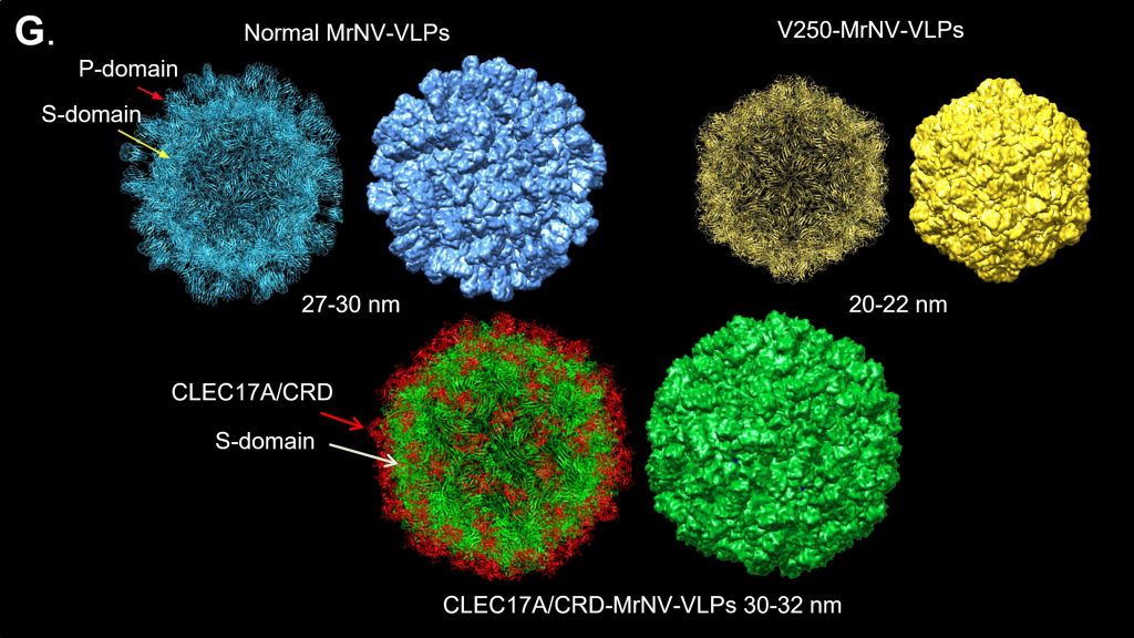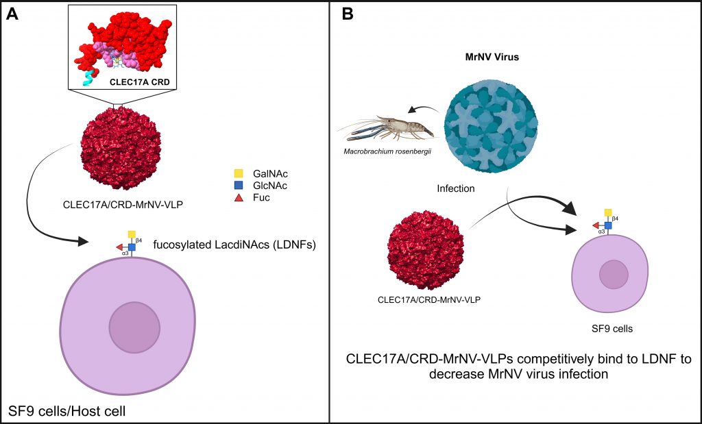 งานวิจัยนี้แสดงให้เห็นว่าอนุภาคโนด้าไวรัสที่ดัดแปลงส่วนยื่นให้มีความจำเพาะกับ CLEC17A ( CLEC17A/CRD-MrNV-VLPs ) มีความสามารถในการจับกับกลุ่มของน้ำตาลฟูโคสได้อย่างมีประสิทธิภาพ และมีศักยภาพสูงในการพัฒนาเป็นอนุภาคโนนาที่ช่วยลดการติดเชื้อของ MrNV ในเซลล์ที่ไวต่อการติดเชื้อได้อย่างมีนัยสำคัญ