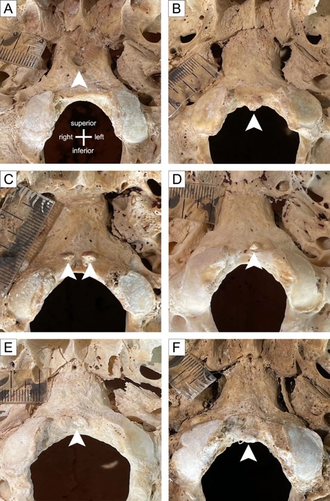 Fossa navicularis magna and tubercle at the anterior margin of the foramen magnum were the most prevalent variants, each observed in 38 skulls (12.5%). The basilar processes were found in 12 skulls (3.9%), condylus tertius in 5 skulls (1.6%), and prebasioccipital arch in 1 skull (0.3%). These variations showed variable morphometry. Fossa navicularis magna averaged 5.1 mm in height and 4.1 mm in breadth; tubercle at the anterior margin of the foramen magnum, 2.7 mm in breadth; basilar processes, 3.9 mm in height; condylus tertius, 6.3 mm in height and 6.9 mm in breadth; and prebasioccipital arch, 10.5 mm in height and 15.5 mm in breadth. No significant sex differences were found for fossa navicularis magna (p = 0.40), tubercle at the anterior margin of foramen magnum (p = 0.61) or basilar process (p = 0.67).