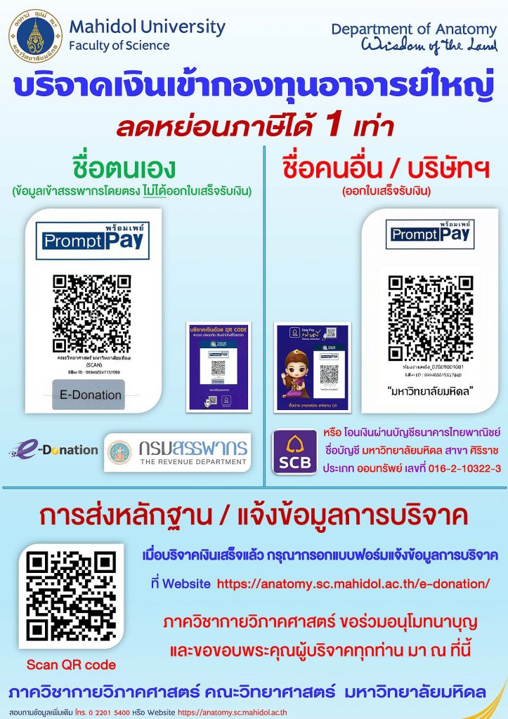 - ข้อมูลส่วนบุคคลในข้อที่ 1 จะถูกรวบรวมและสรุปเป็นรายวัน/รายเดือน เพื่อแจ้งยอดการบริจาคผ่าน E-Donation ภาควิชากายวิภาคศาสตร์ ส่งให้ งานคลังและพัสดุ คณะวิทยาศาสตร์ มหาวิทยาลัยมหิดล ได้รับทราบข้อมูลต่อไป