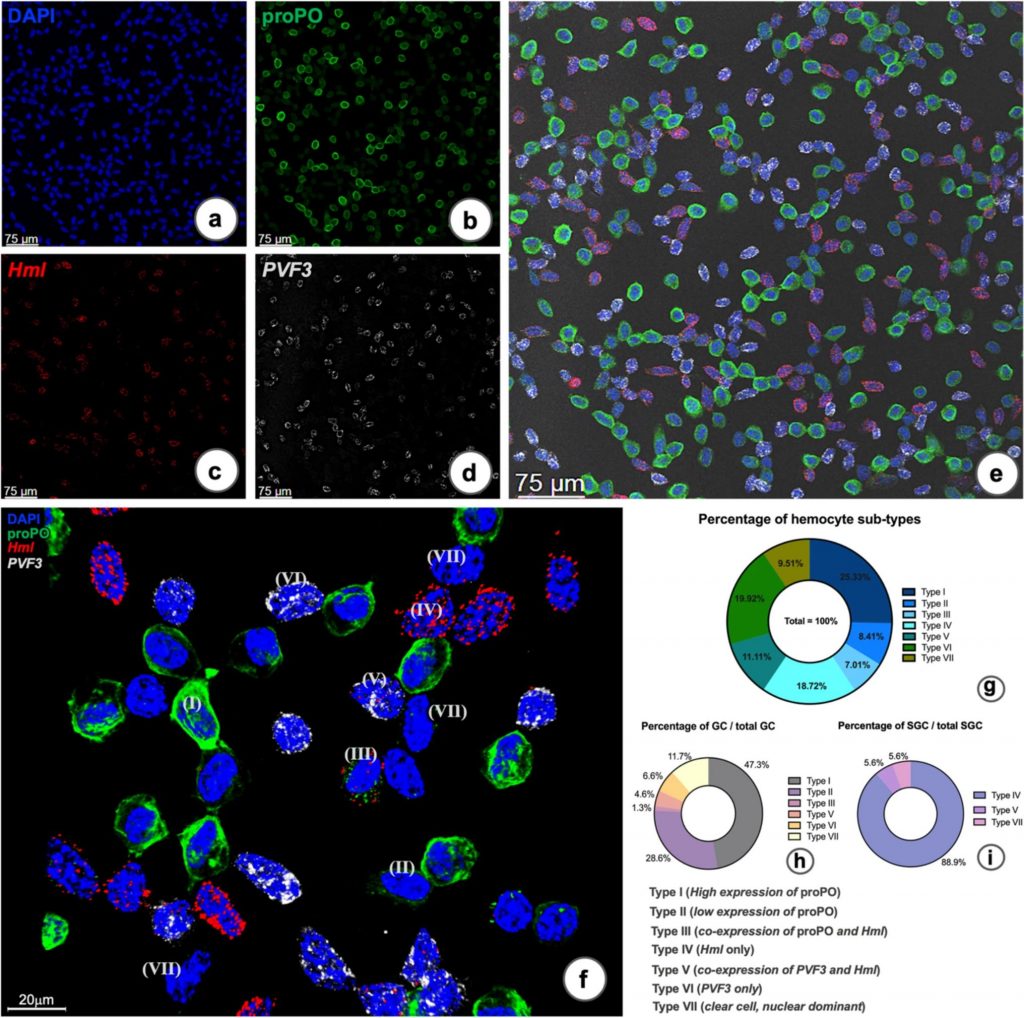 The hematopoietic tissue (HPT) and anterior proliferation center (APC) are the main hemocyte-producing organs of the freshwater crayfish, Pacifastacus leniusculus. To deepen our understanding of immune responses to various pathogens, it is essential to identify distinct hemocyte subpopulations with specific functions and to further explore how these cells are generated. Here we provide an in-depth histological study of the HPT and APC in order to localize cell types in different developmental stages, and to provide some information regarding the hemocyte differentiation in the crayfish. We localized mRNA expression of previously identified genes in the HPT/APC and hemocytes by RNA-FISH. The expression of hemolectin and transglutaminase 1 was shown to be co-localized in a high number of the HPT cells, while transglutaminase 2 was expressed in different cell types mainly associated with epithelium or endothelium. Furthermore, by double RNA-FISH for hemolectin and a previously unidentified PDGF-like factor, combined with immunostaining for prophenoloxidase, we could identify several different subtypes of hemocytes, indicating that the immune function of hemocytes in crayfish is more diversified and complex than previously appreciated.